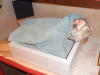This Barbie is sleeping in the kitchen on a night stand that Pieper moved from the bedroom. If you look closely you can see that Barbie has her sunglasses on. I guess the flourescent lights must be pretty bright.